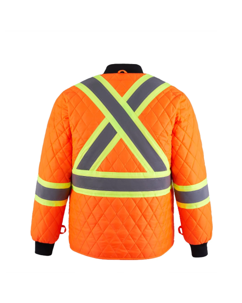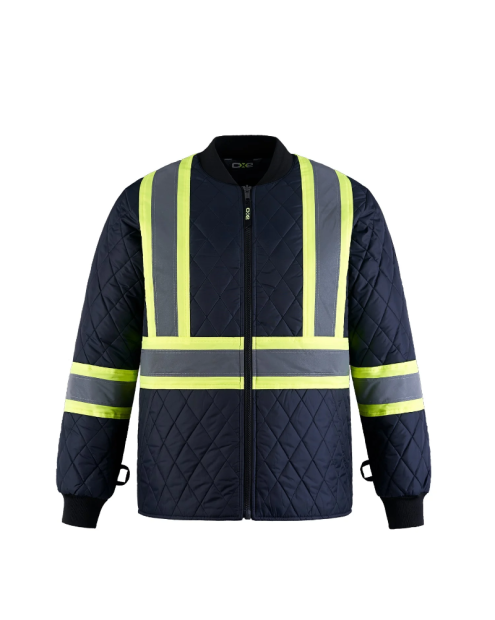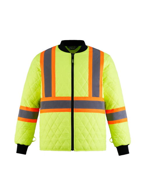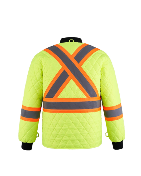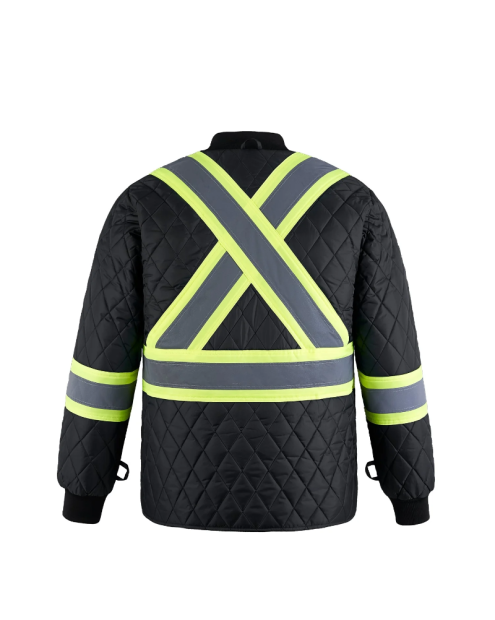 - Bandes contrastantes haute visibilité de 4 po avec ruban réfléchissant de 2 po à l’avant et au dos, de même que sur les manches